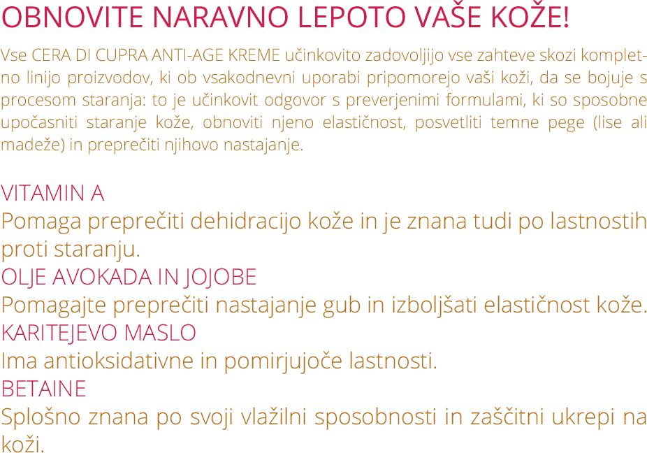 Krema proti gubicam: to ni samo učinkovita krema proti gubicam, ampak tudi dobra podpora toniranju kože in preprečevanju nastanka starostnih peg. Zahvaljujoč drastičnemu učinku grozdnih polifenolov, vitaminu E in prestrukturiranju kože z beta glukanom, ta krema vidno zmanjša globino gubic in vidne znake staranja kože, medtem ko preprečuje nastanek novih z učinkovinami Karitejevega masla, avokadovega olja, jojobovega olja in vitaminom A, ki naredijo kožo čez čas bolj kompaktno in elastično. Še več, učinkoviti UV filtri ščitijo občutljivo kožo pred škodljivimi sončnimi žarki in preprečujejo nastanek peg.