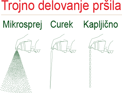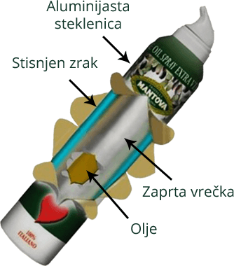 Z uporabo spreyleggera zmanjšamo uporabo za cca 90%. Tehnologija našega izdelka je oblikovana tako, da ohranja vse izvirne lastnosti olj, ki so shranjena v nepredušni vrečki, izven dosega zraka in svetlobe. Zahvaljujoč revolucionarni metodi ˝ventilne vrečke˝ izdelek ne vsebuje nobenih dodatnih aditivov, emulgatorjev in plinov. Trojno delovanje pršila – Mikrosprej, kapljično ali curek